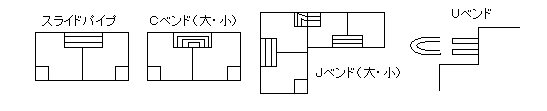 パネルの配管接続 長手方向につなぐ場合 …… 接続するパネルに、スライドパイプを口一付けして下さい。 短手方向につなぐ場合 …… 接続するパネルに、Cベンド(大・小)を口一付けして下さい。 90°につなぐ場合 …… 接続するパネルに、Jベンド(大・小)を口一付けして下さい。